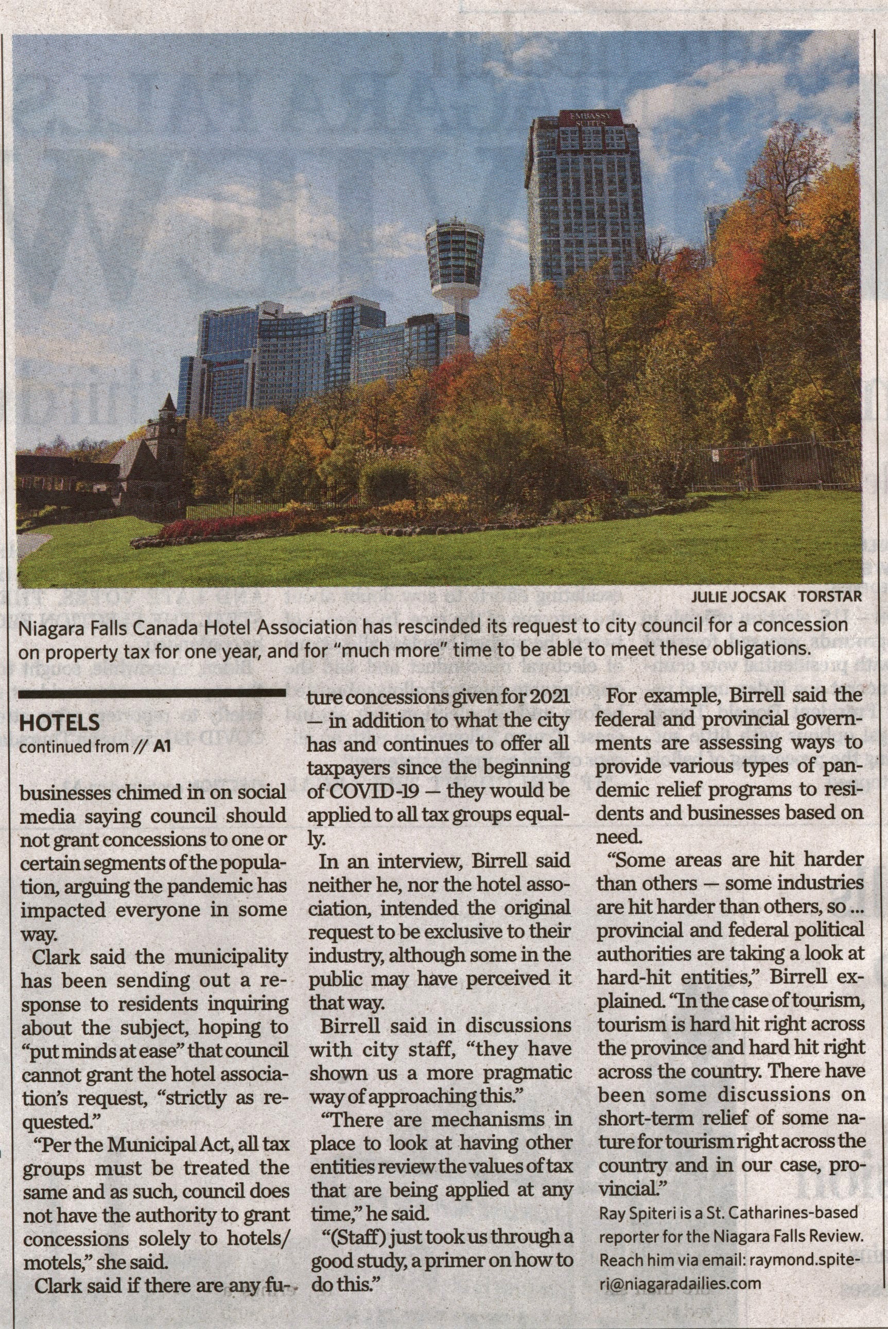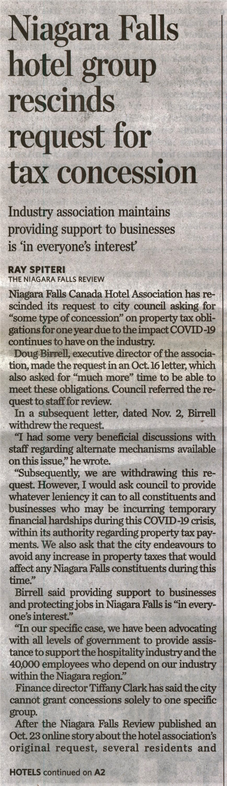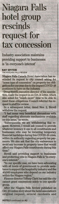 - Niagara Falls hotel group rescinds request for tax concession : Industry association maintains providing support to businesses is 'in everyone's interest'