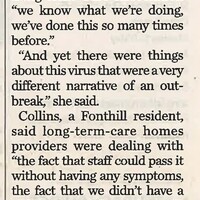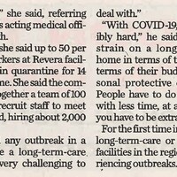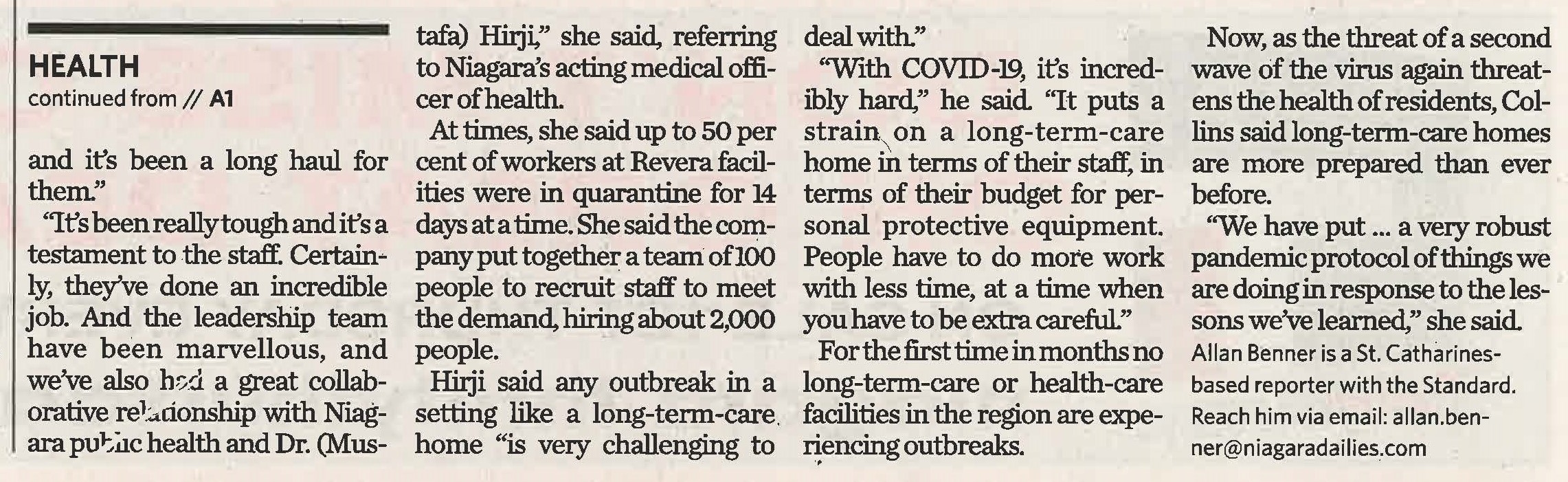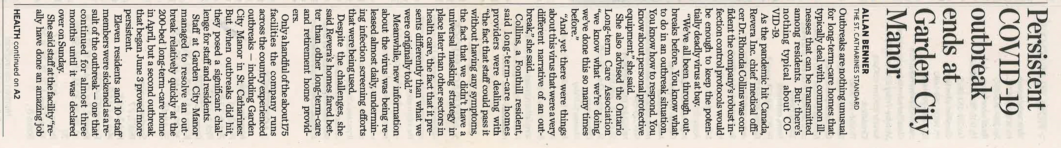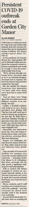 - COVID-19 pandemic / Garden City Manor / Revera Inc. / Collins, Rhonda Dr. / Ontario Long-term Care Association / infection control protocols / Hirji, Mustafa Dr. / Niagara public health