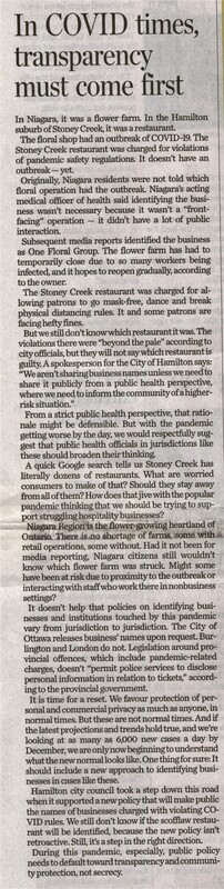 - COVID-19 pandemic / One Floral Group / Niagara Public Health / transparency needed