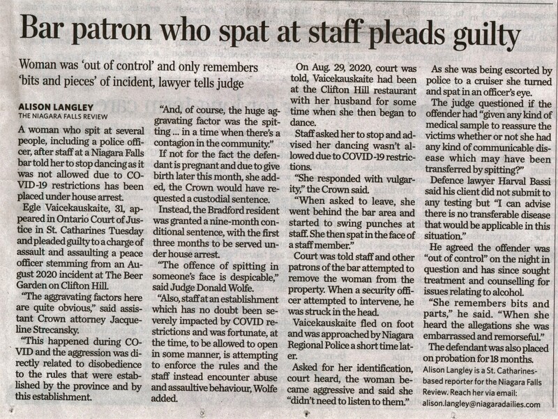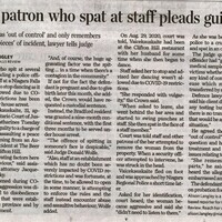 - Bar patron who spat at staff pleads guilty : Woman was 'out of control' and only remembers 'bits and pieces' of incident, lawyer tells judge