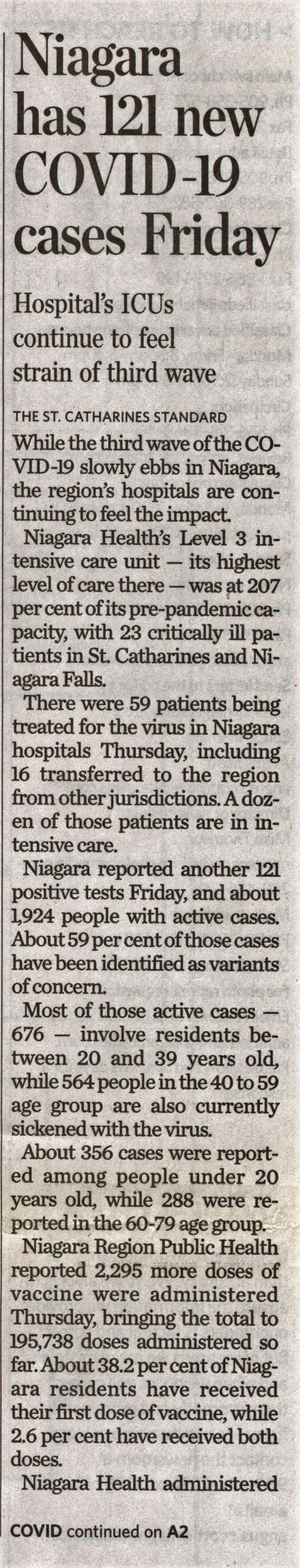 - Niagara has 121 new COVID-19 cases Friday : Hospital's ICU's continue to feel strain of third wave