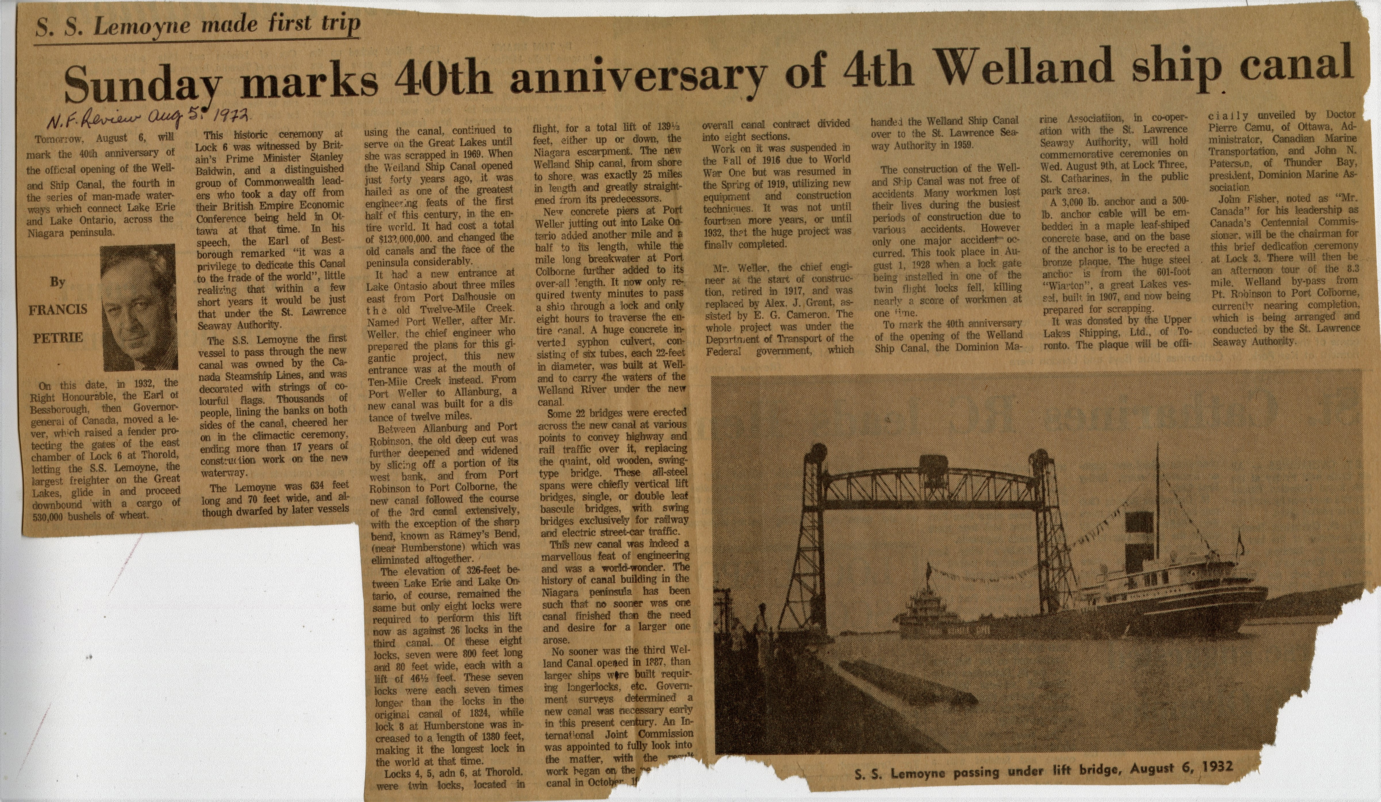 - S. S. Lemoyne made first trip : Sunday marks 40th anniversary of 4th Welland ship canal