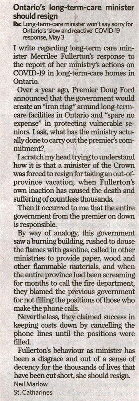 - Ontario's long-term-care minister should resign : Re : Long-term-care minister won't say sorry for Ontario's 'slow and reactive' COVID-19 response, May 3