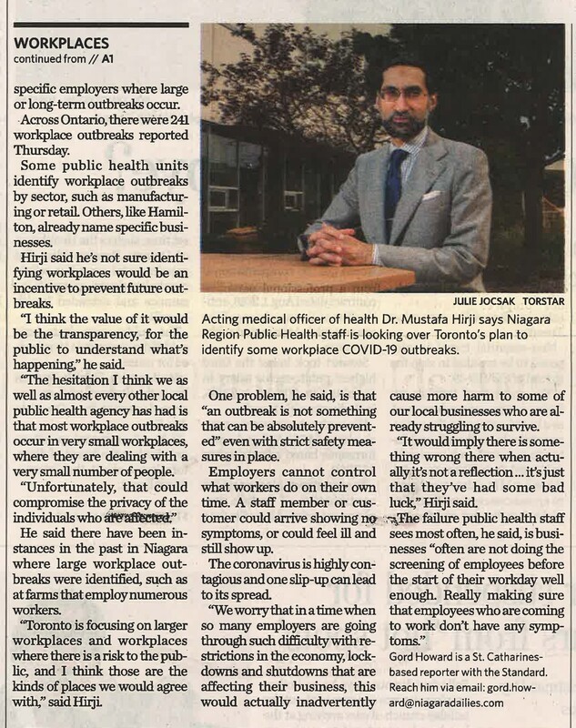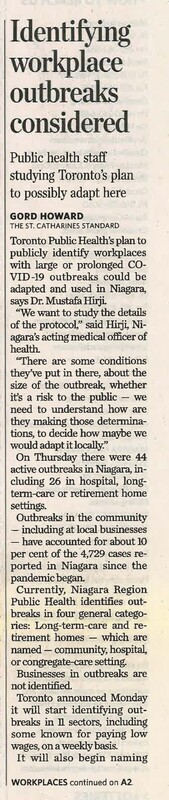 - Identifying workplace outbreaks considered : Public health staff studying Toronto's plan to possibly adapt here