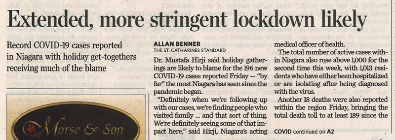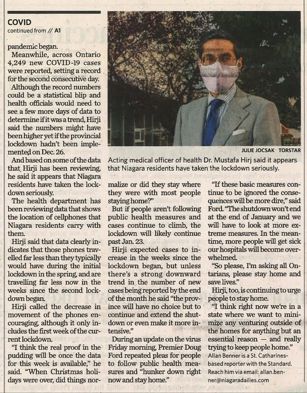 Extended, more stringent lockdown likely : Record COVID-19 cases reported in Niagara with holiday get-togethers receiving much of the blame