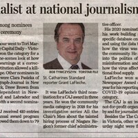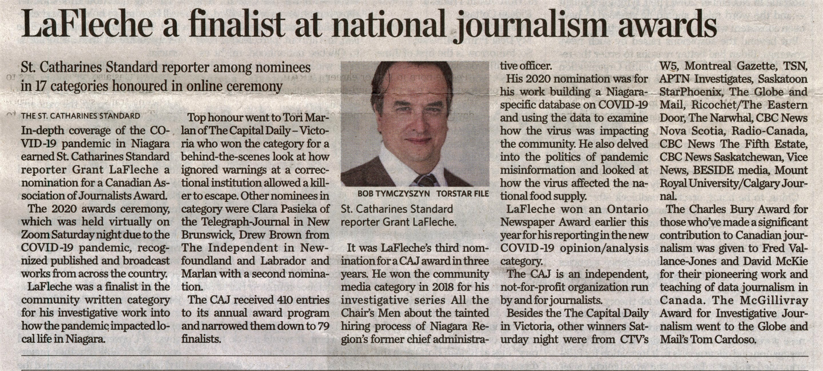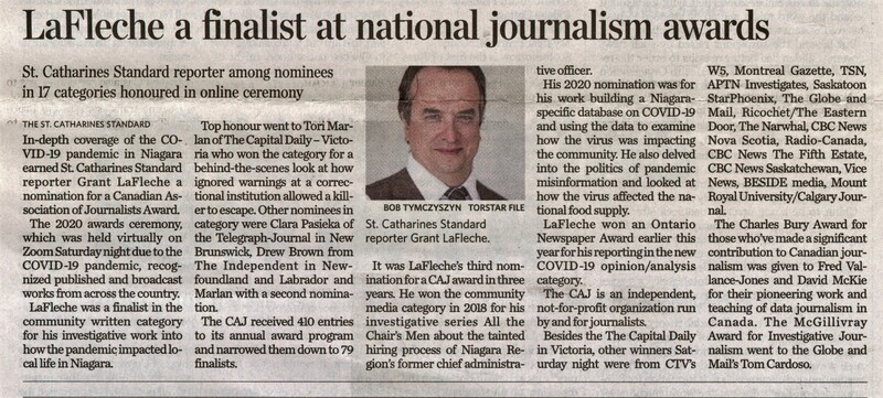 LaFleche a finalist at national journalism awards : St. Catharines Standard reporter among nominees in 17 catagories honoured in online ceremony