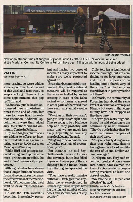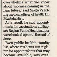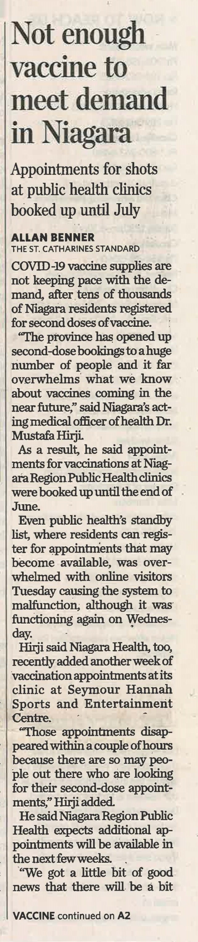 - Not enough vaccine to meet demand in Niagara : appointments for shots at public health clinics booked up until July