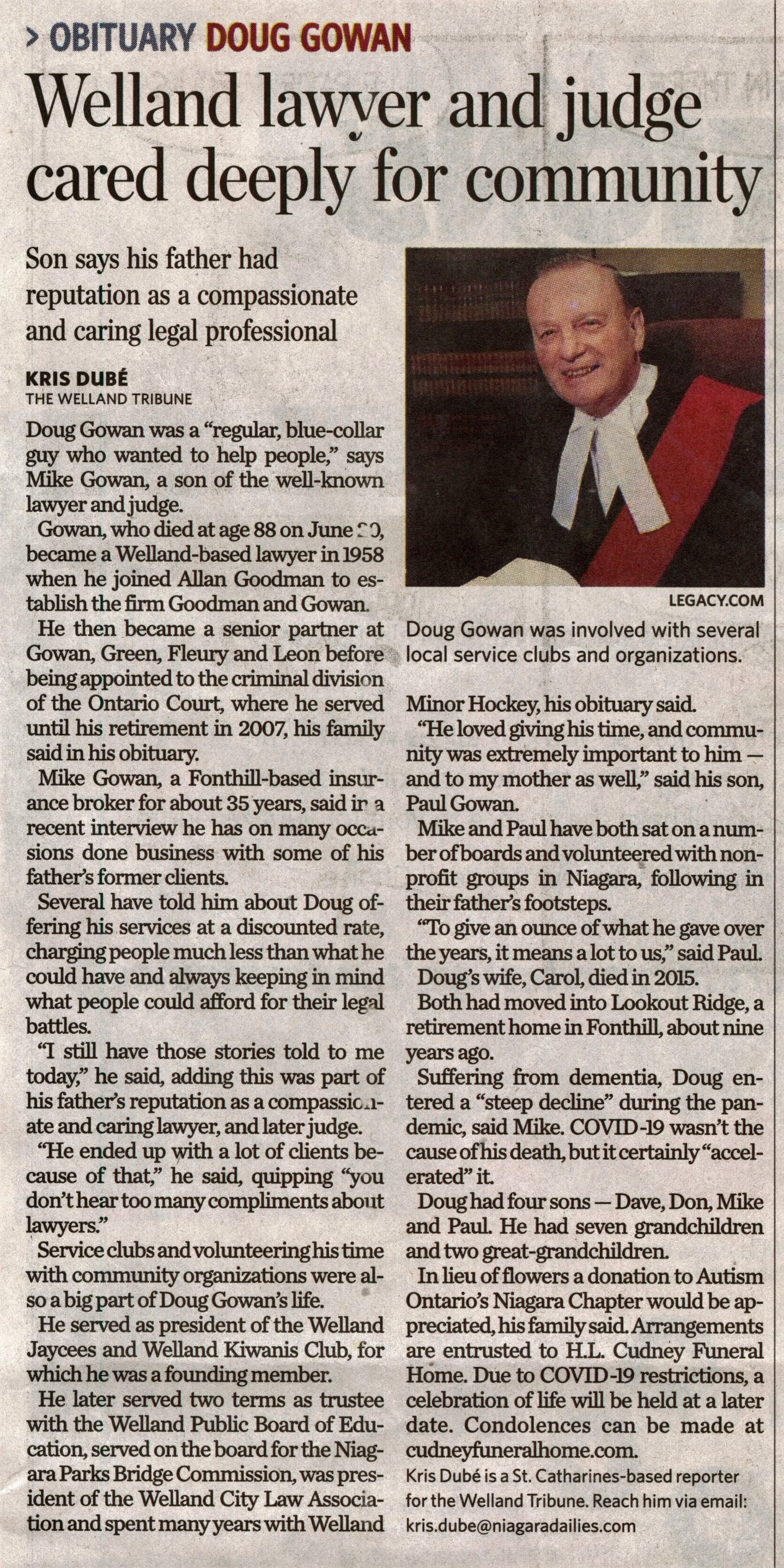 - Welland lawyer and judge cared deeply for community : Son says his father had reputation as a compassionate and caring legal professional