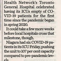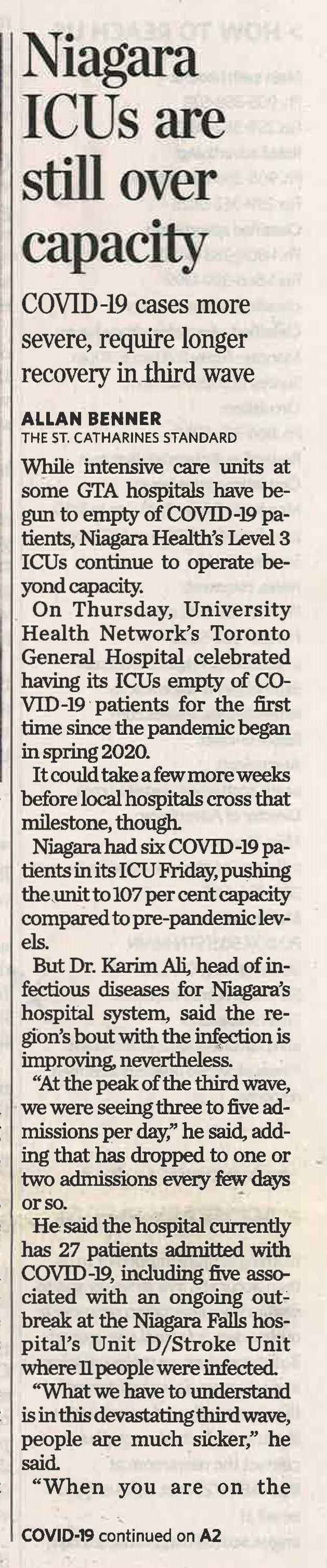 - Niagara ICUs are still over capacity : COVID-19 cases more severe, require longer recovery in third wave