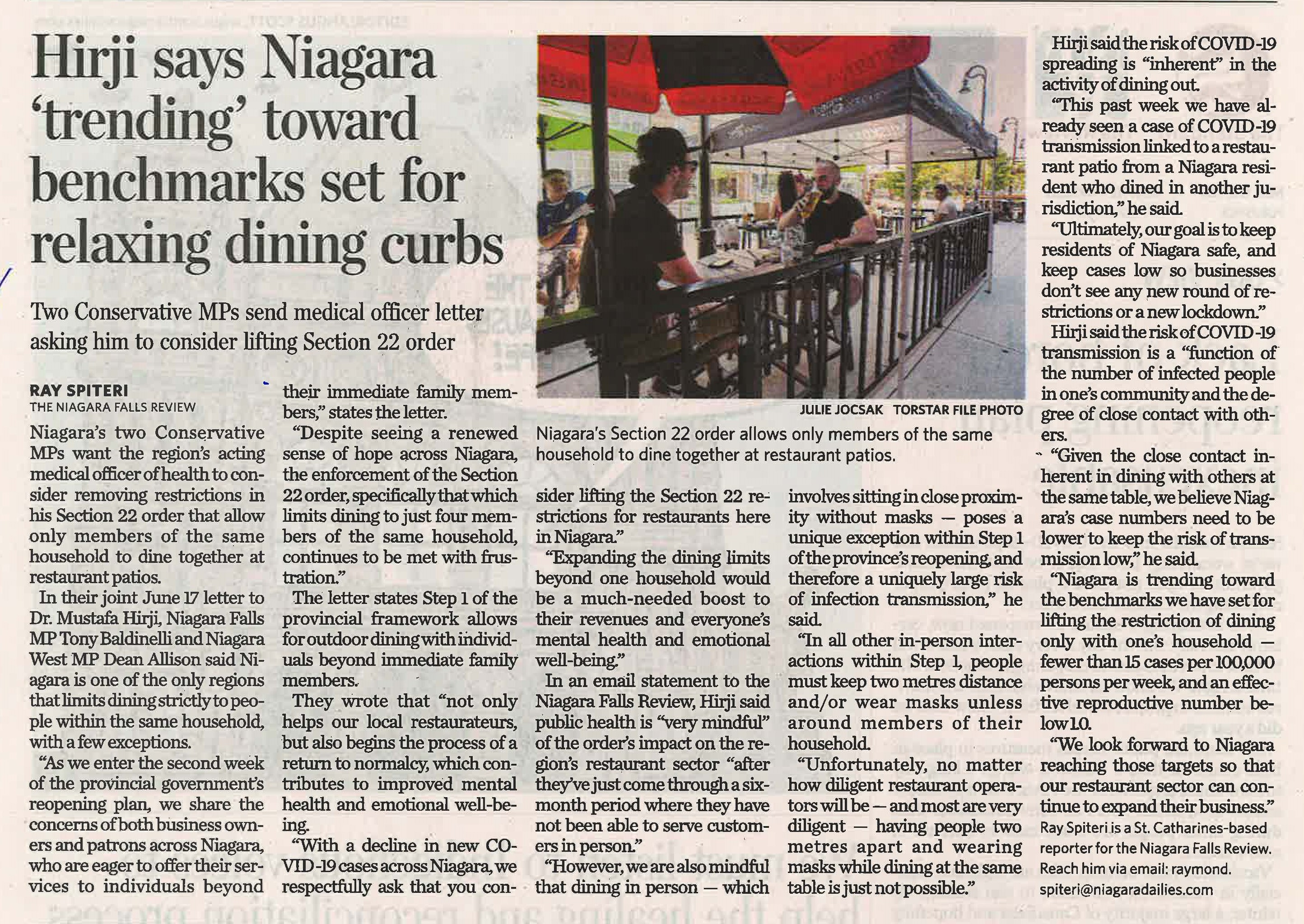- Hirji says Niagara trending toward benchmarks set for relaxing dining curbs : two Conservative MPs send medical officer letter asking him to consider lifting Section 22 order