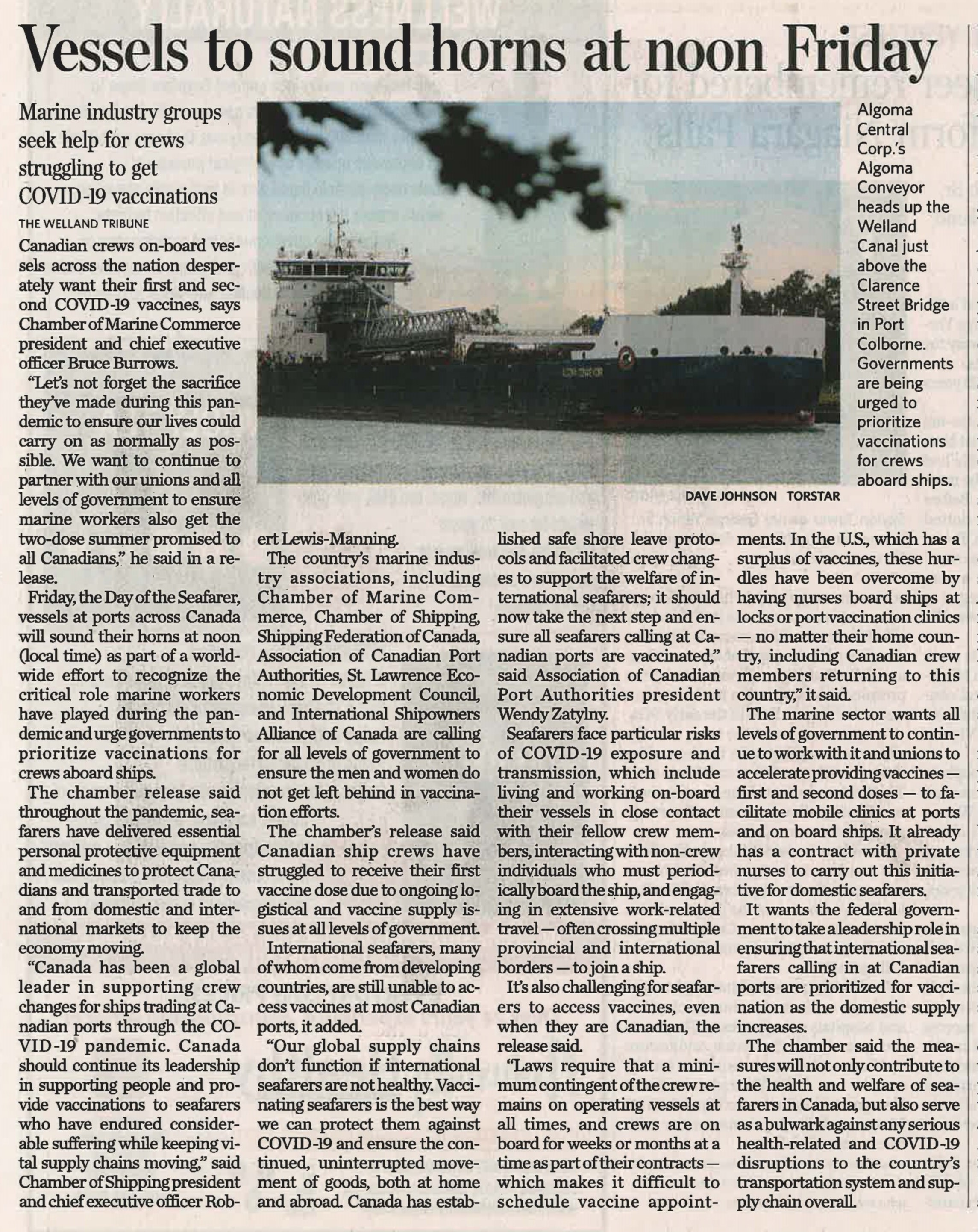 - Vessels to sound horns at noon Friday : marine industry groups seek help for crews struggling to get COVID-19 vaccinations