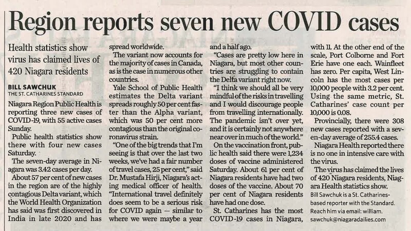 - Region reports seven new COVID cases: Health statistics show virus has claimed lives of 420 Niagara residents
