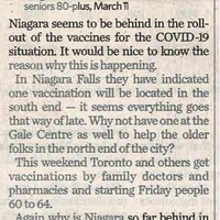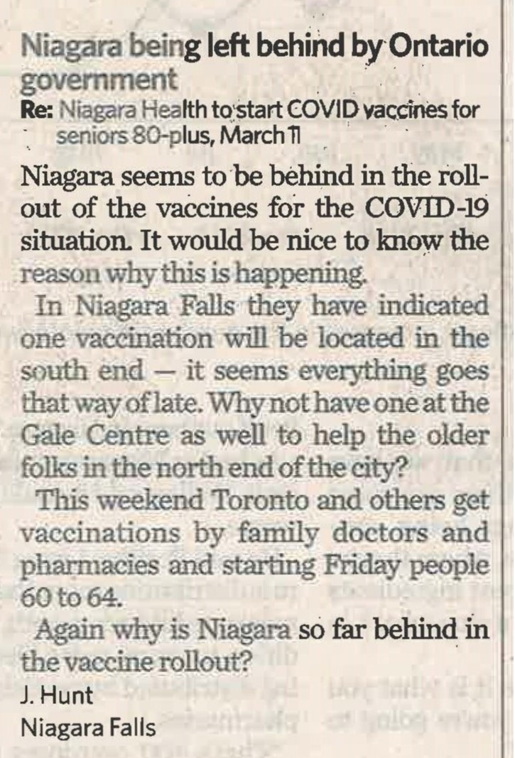 - Niagara being left behind by Ontario government Re: Niagara Health to start COVID vaccines for seniors 80-plus, March 11