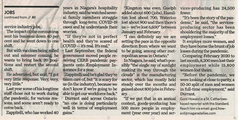 Pandemic concerns cloud Niagara's job market : Last month, 6,600 residents lost their employment; restaurant owner suspects people are wary of holding front-line service industry jobs