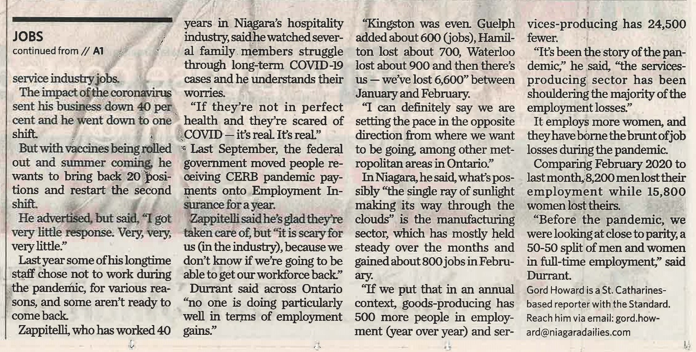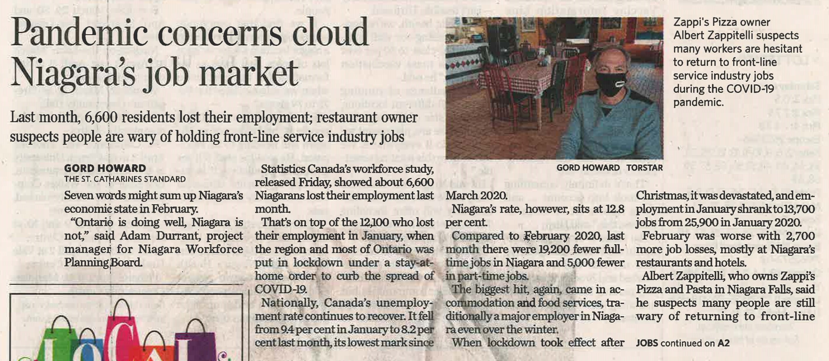 - Pandemic concerns cloud Niagara's job market : Last month, 6,600 residents lost their employment; restaurant owner suspects people are wary of holding front-line service industry jobs