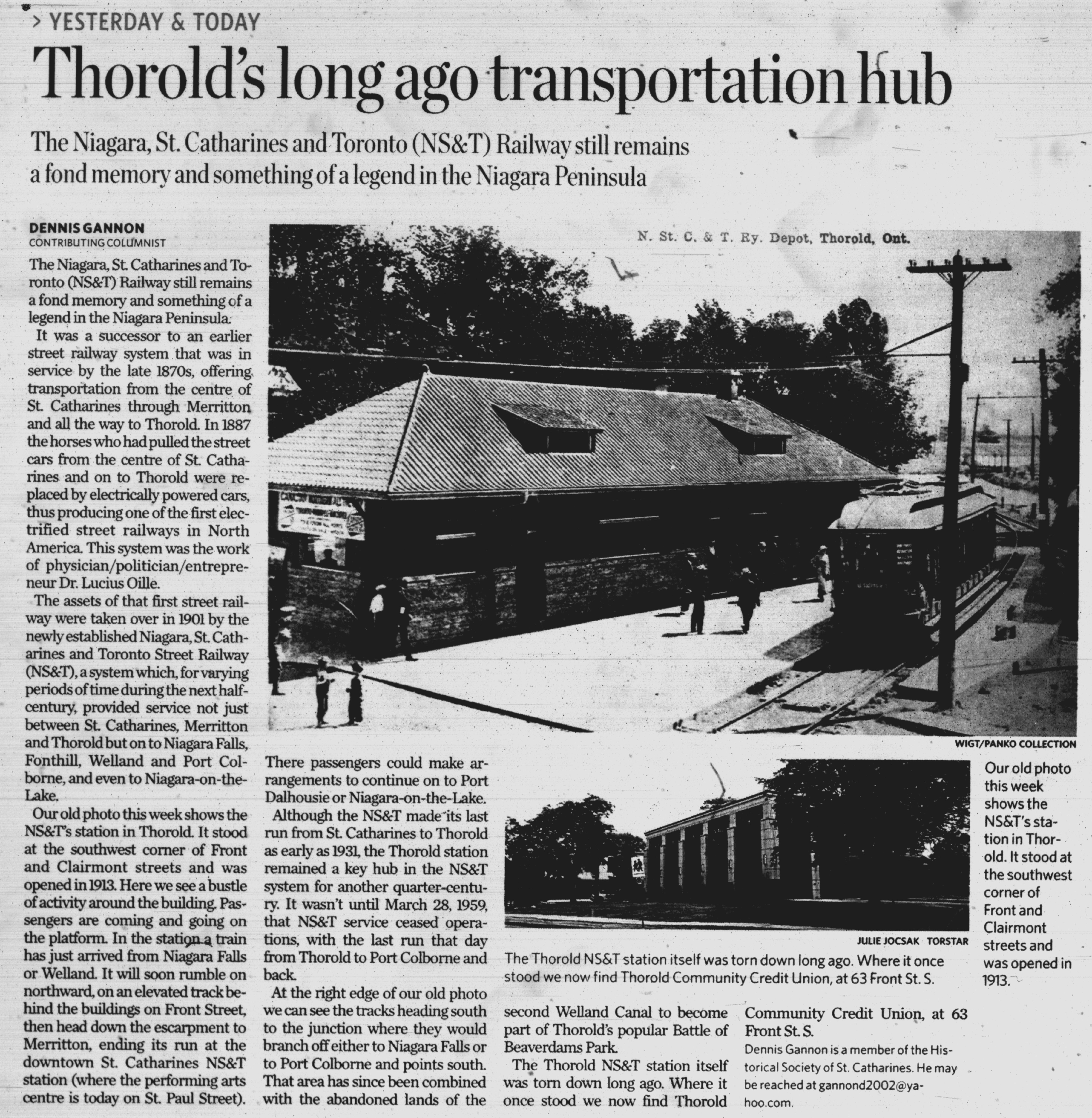 - Thorold's long ago transportation hub : The Niagara, St. Catharines and Toronto (NS&T) Railway still remains a fond memory and something of a legend in the Niagara Peninsula