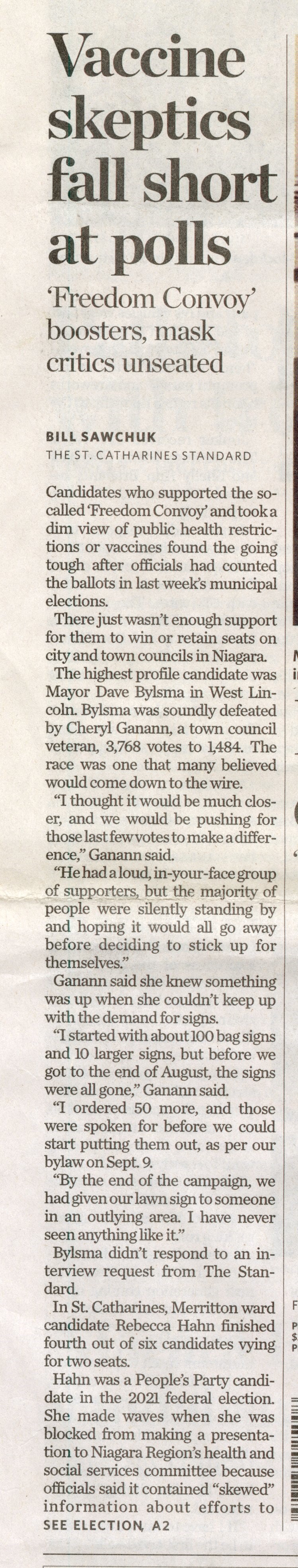 - Vaccine skeptics fall short at polls : 'Freedom Convoy' boosters, mask critics unseated