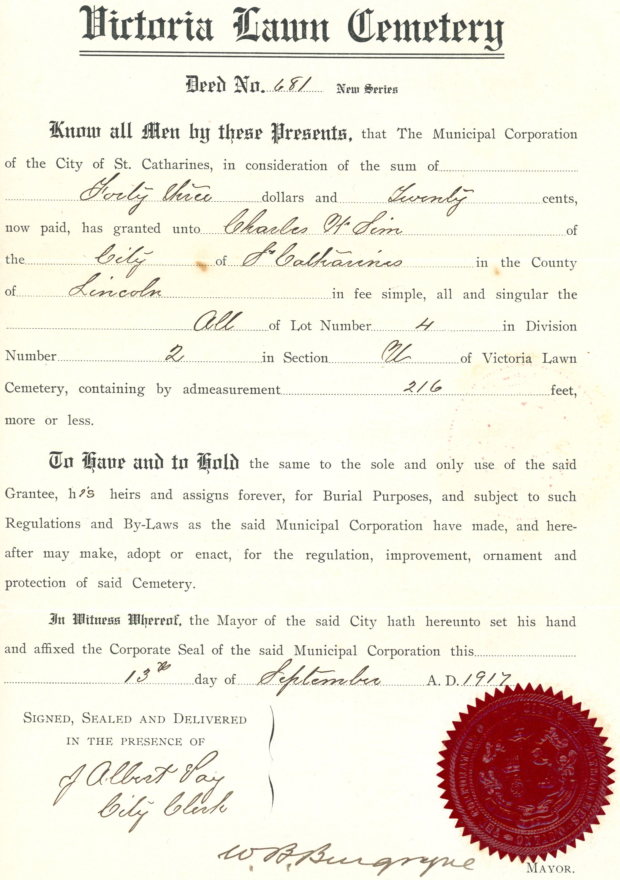 Victoria Lawn Cemetery Deed