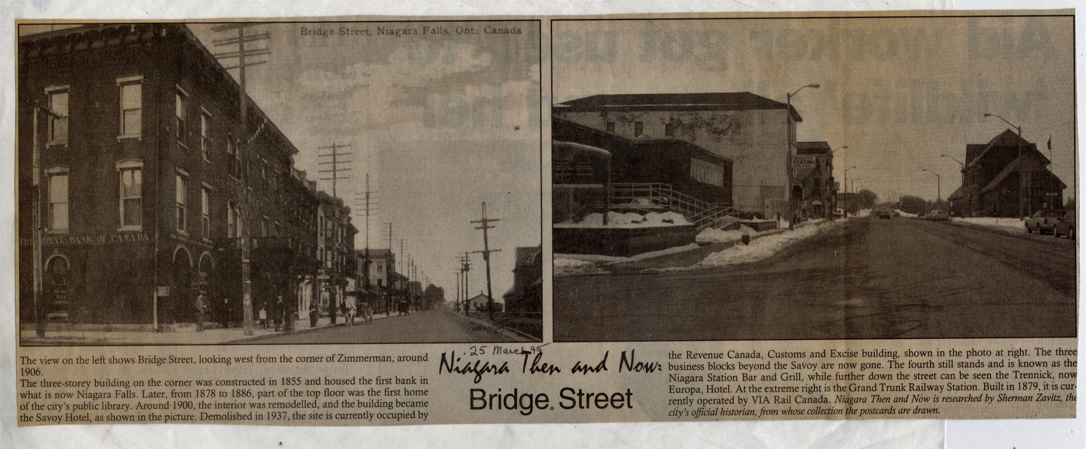 - Bridge Street / Zimmerman Ave /1906 / Savoy Hotel / Public Library / Via Rail / Trennick/Europa Hotel / Revenue Canada / Canada Customs Building