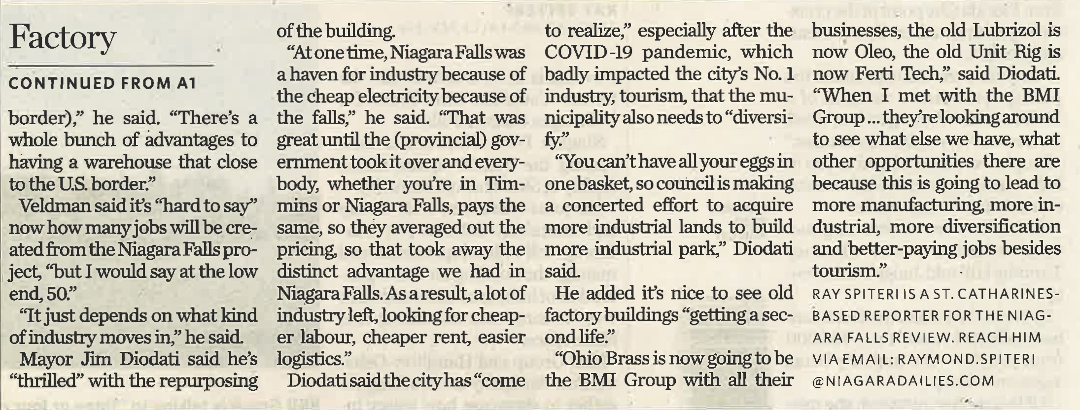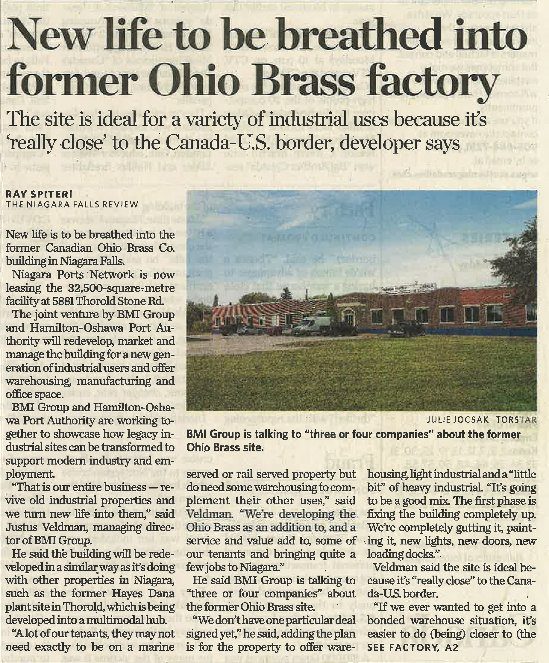 - Canadian Ohio Brass Co. / Niagara Ports Network / 5881 Thorold Stone Road / BMI Group / Hamilton-Oshawa Port Authority / Veldman, Justus / Diodati, Jim