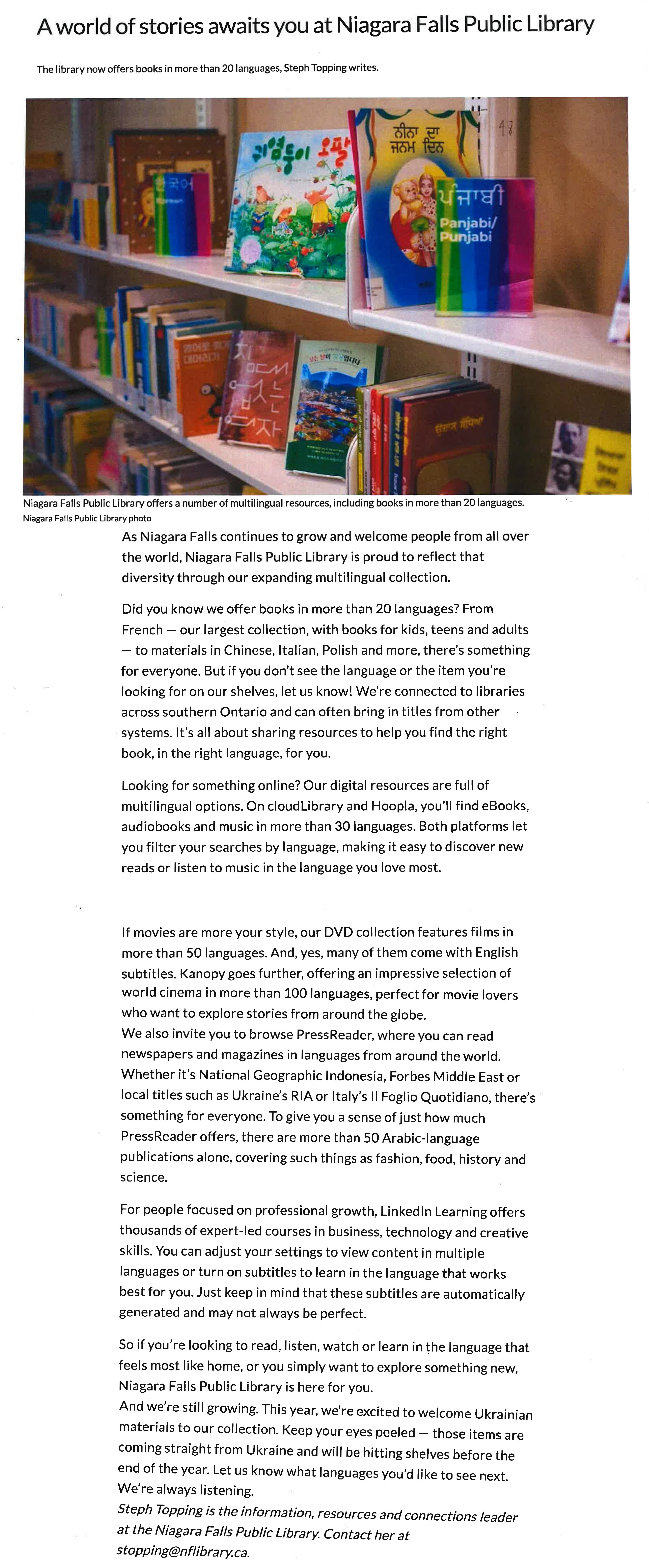 - A world of stories awaits you at Niagara Falls Public Library : The Library now offers books in more than 20 languages