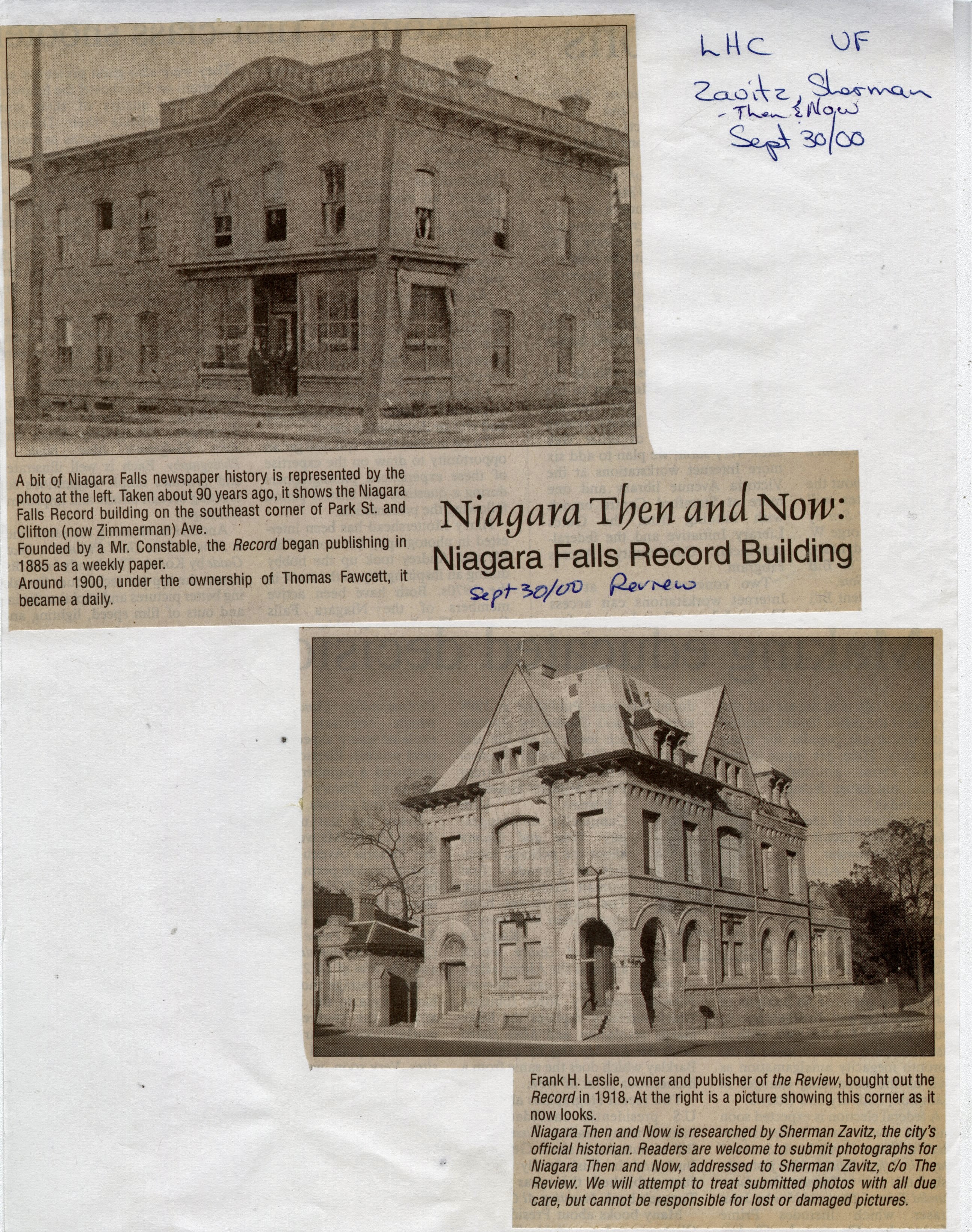 - Sherman Zavitz Niagara Falls Then and Now Newspaper Column Collection