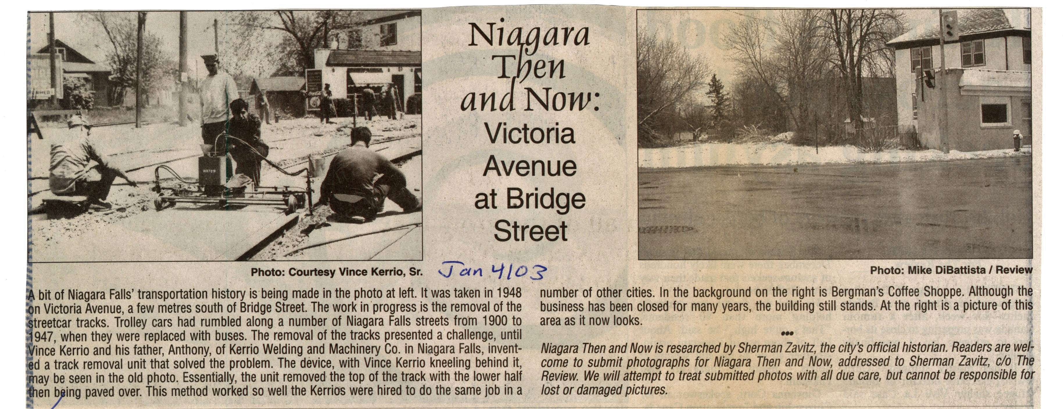 - Transportation history / Streetcar tracks removal / Bridge Street / 1948 / Trolley cars / Kerrio Welding and Machinery / Kerrio, Vince / Kerrio, Anthony / invented track removal unit / Bergman's Coffee Shop