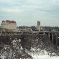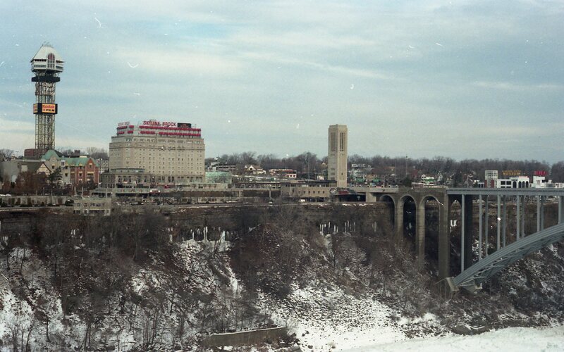- Shots of Niagara Falls, Ont. skyline and Niagara Falls NY skyline.