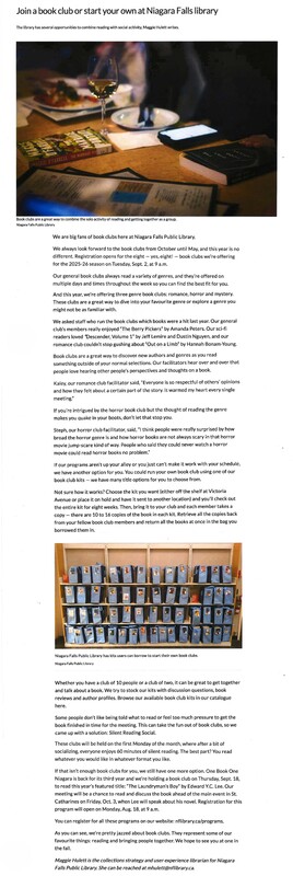 - Join a book club or start your own at Niagara Falls Library : The library has several opportunities to combine reading with social activity