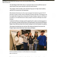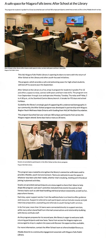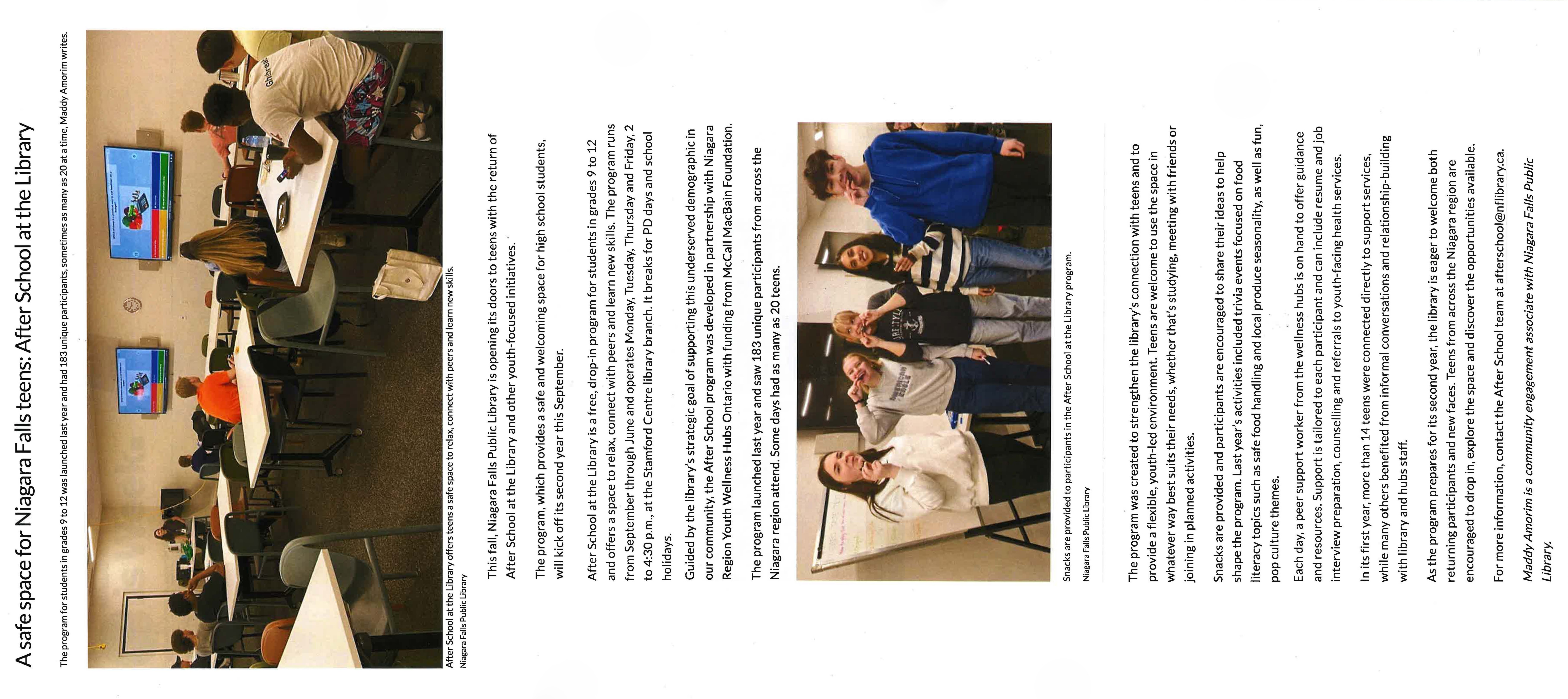 - A safe space for Niagara Falls teens: After School at the Library : The program for students in grades 9 to 12 was launched last year and had 183 unique participants, sometimes as many as 20 at a time