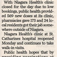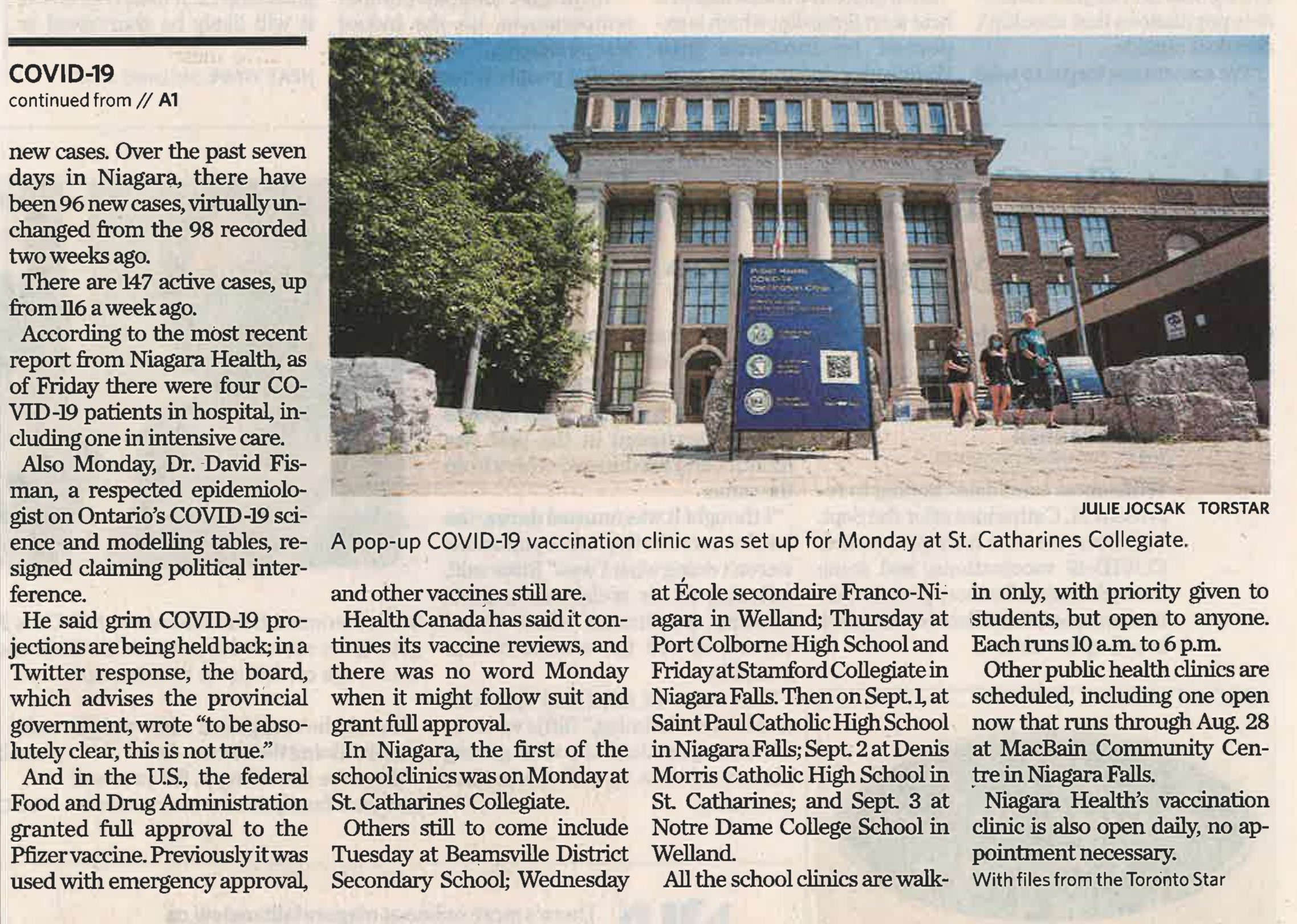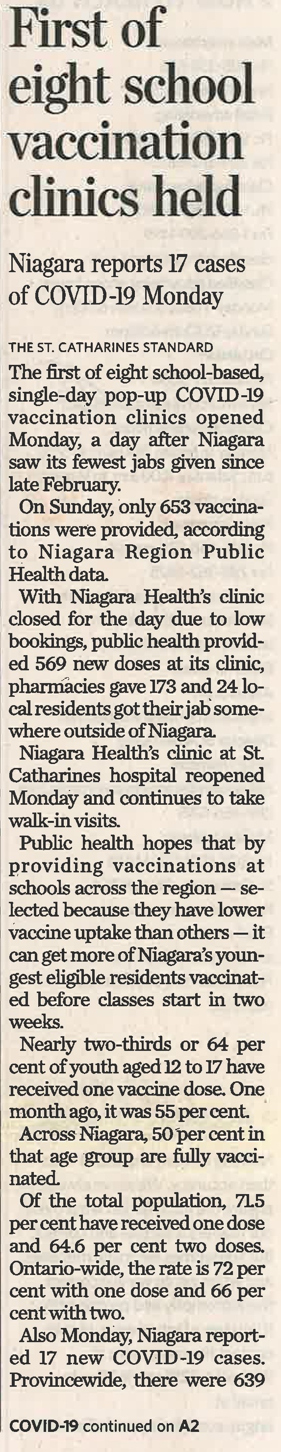 - First of eight school vaccination clinics held : Niagara reports 17 cases of COVID-19 Monday