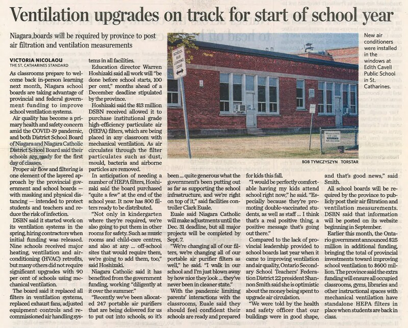 - Ventilation upgrades on track for start of school year : Niagara boards will be required by province to post air filtration and ventilation measurements
