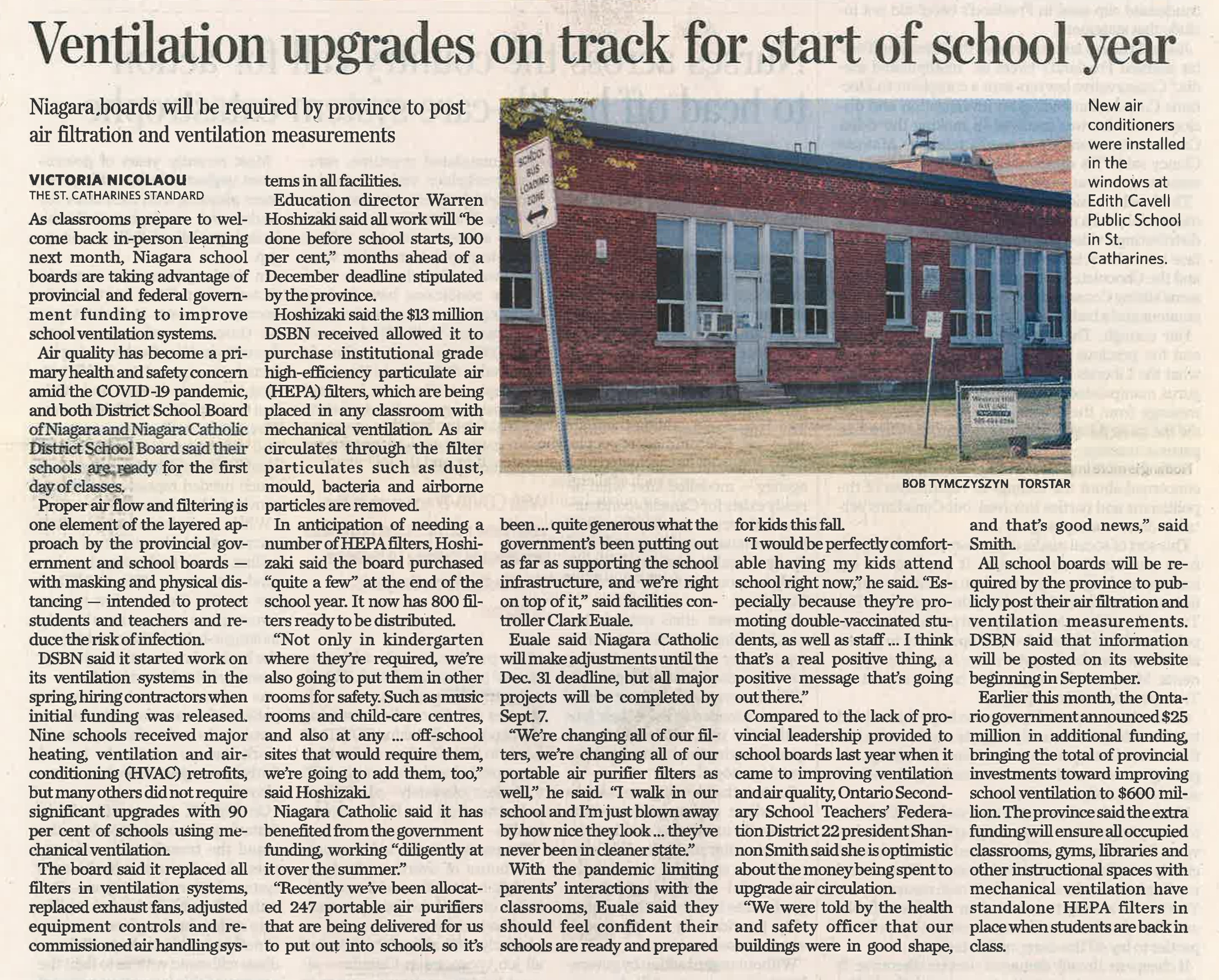 Ventilation upgrades on track for start of school year : Niagara boards will be required by province to post air filtration and ventilation measurements