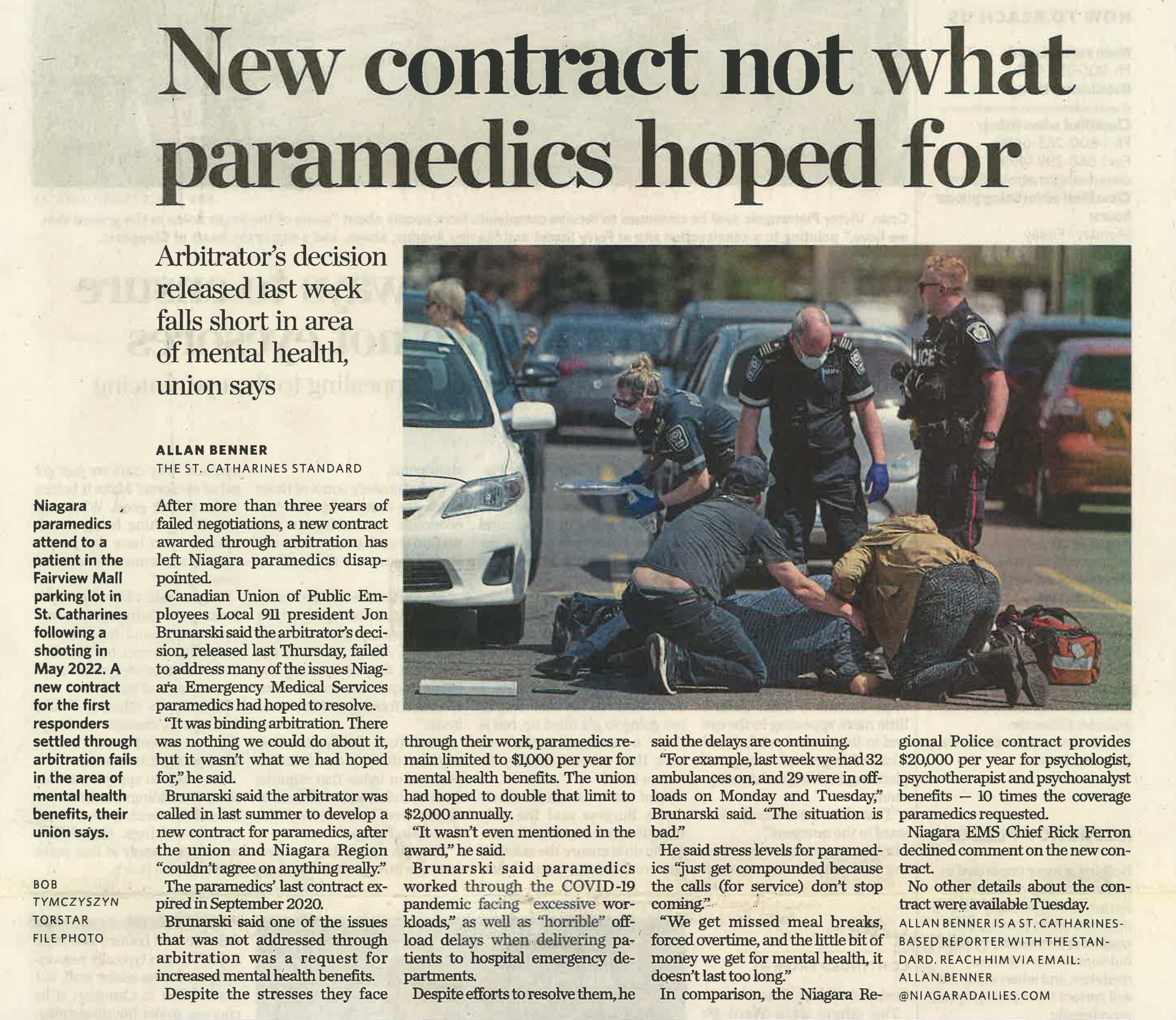 - New contract not what paramedics hoped for : arbitrator's decision released last week falls short in area of mental health, union says