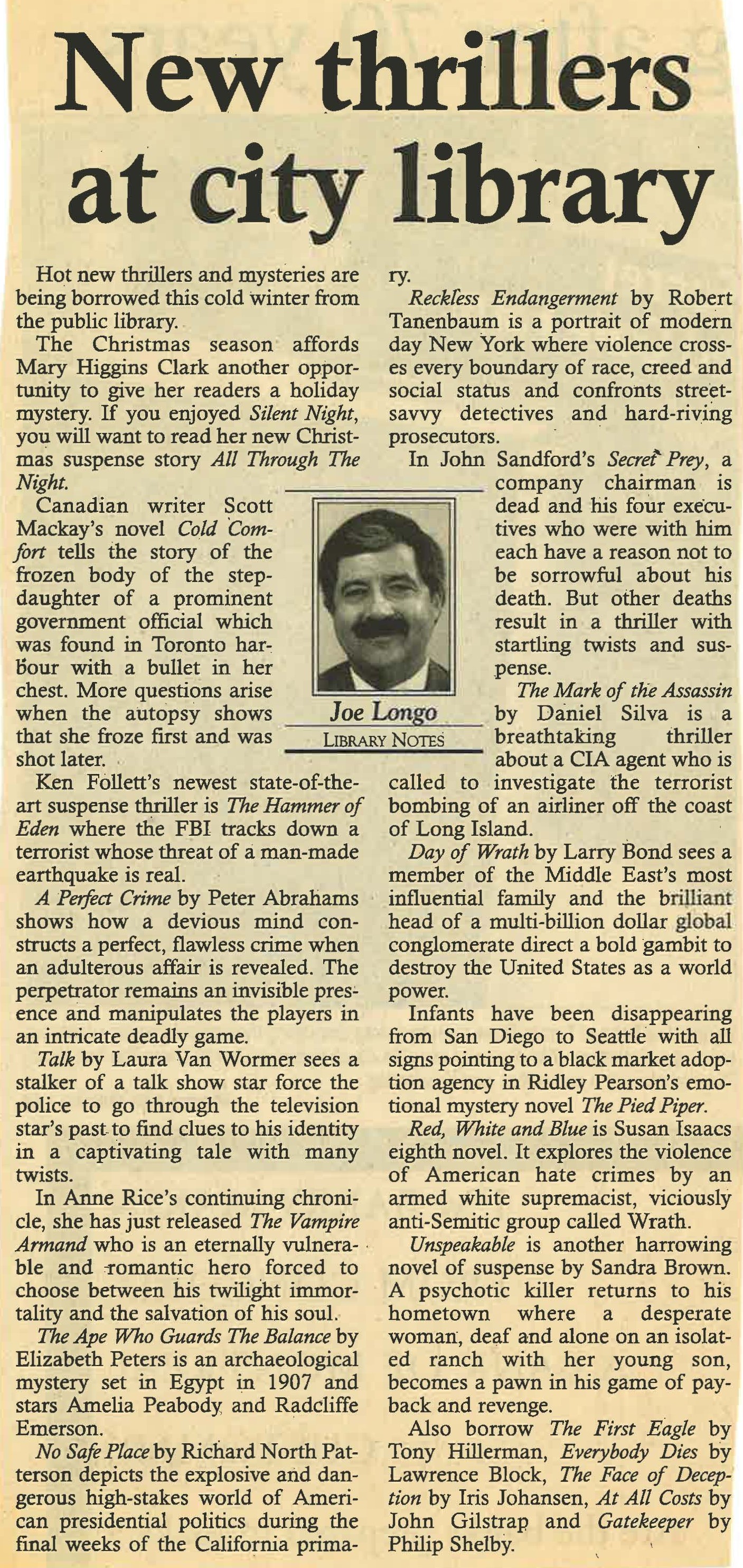- thrillers and mysteries / Higgins Clark, Mary / Mackay, Scott / Follett, Ken / Rice, Anne / Peters, Elizabeth