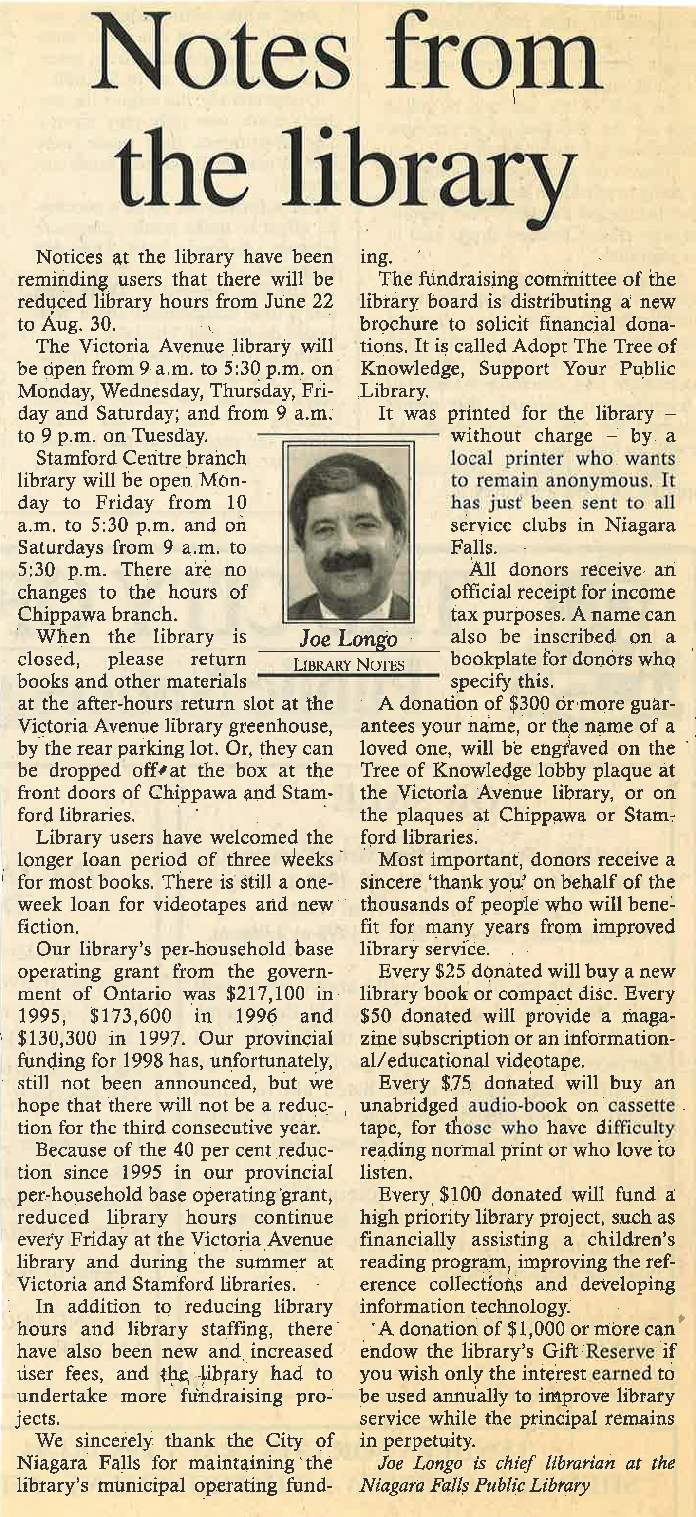 - reduced summer hours / increased user fees / fundraising / Tree of Knowledge / Ontario operating grant / municipal operating fund