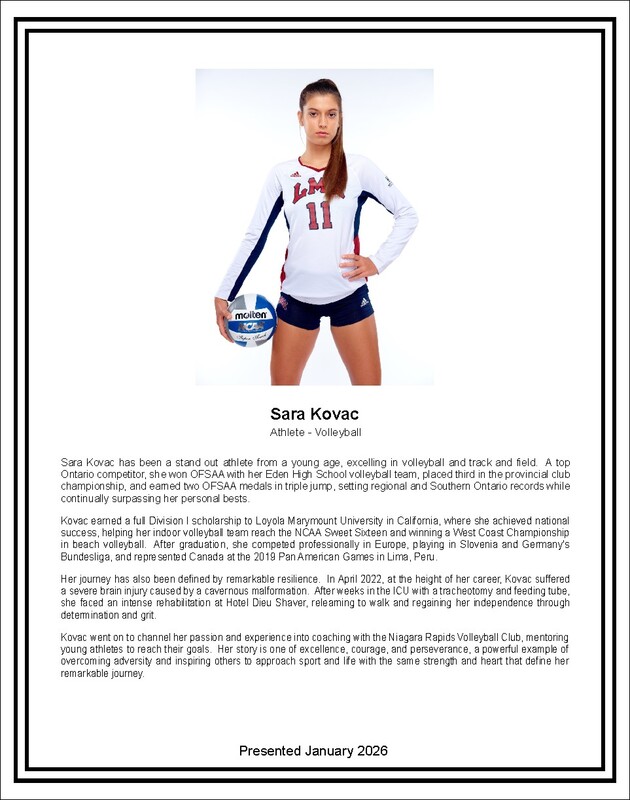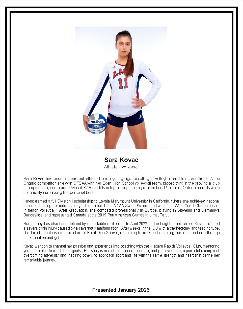 Kovac went on to channel her passion and experience into coaching with the Niagara Rapids Volleyball Club, mentoring young athletes to reach their goals. Her story is one of excellence, courage, and perseverance, a powerful example of overcoming adversity and inspiring others to approach sport and life with the same strength and heart that define her remarkable journey. - This image may not be reproduced without the written consent of the City of Niagara Falls Department of Parks, Recreation and Culture