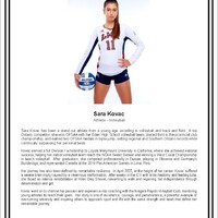 Sara Kovac has been a stand out athlete from a young age, excelling in volleyball and track and field. A top Ontario competitor, she won OFSAA with her Eden High School volleyball team, placed third in the provincial club championship, and eamed two OFSAA medals in triple jump, setting regional and Southern Ontario records while continually surpassing her personal bests.