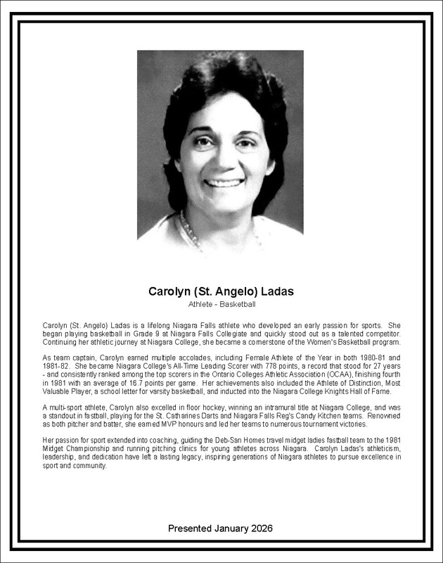 Carolyn (St. Angelo) Ladas is a lifelong Niagara Falls athlete who developed an early passion for sports. She began playing basketball in Grade 9 at Niagara Falls Collegiate and quickly stood out as a talented competitor. Continuing her athletic journey at Niagara College, she became a cornerstone of the Women's Basketball program.