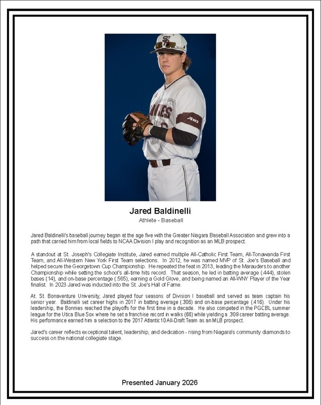 Championship while setting the school's all-time hits record. That season, he led in batting average (444), stolen bases (14), and on-base percentage (565), earning a Gold Glove, and being named an All-WNY Player of the Year finalist. In 2023 Jared was inducted into the St. Joe's Hall of Fame.