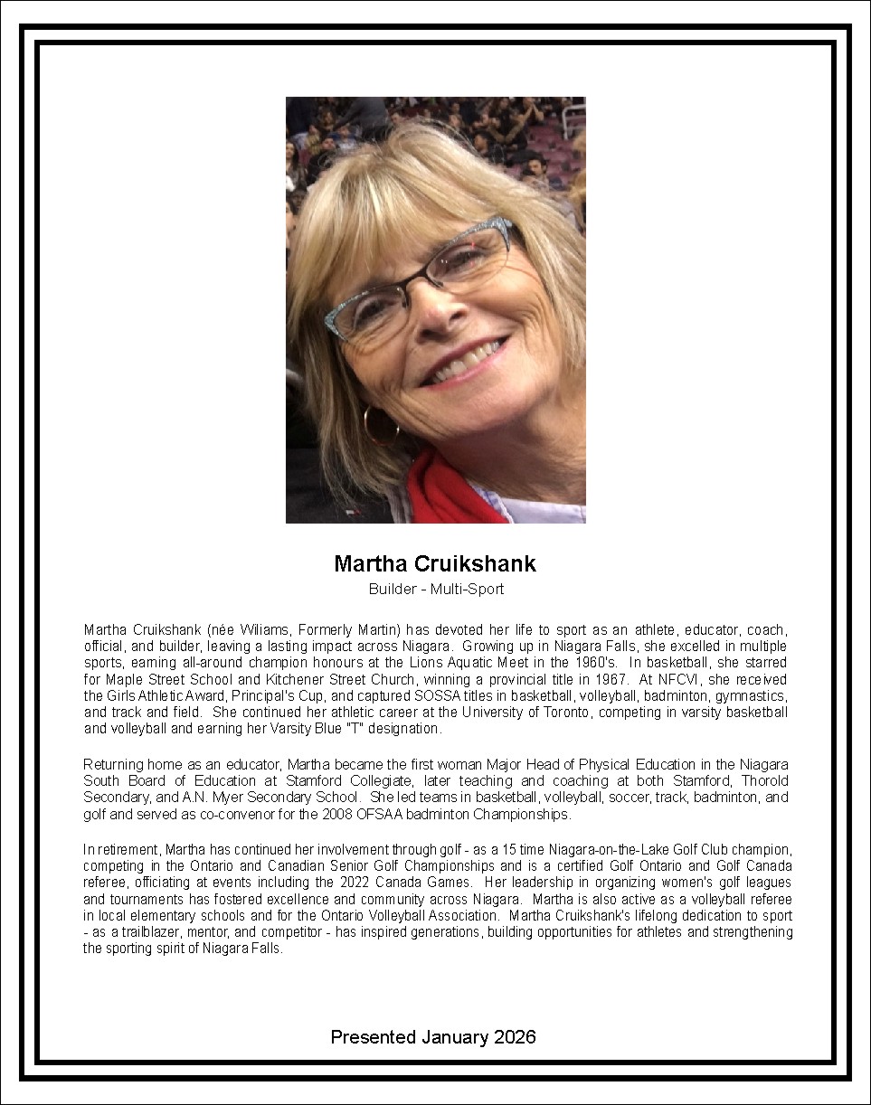 In retirement, Martha has continued her involvement through golf - as a 15 time Niagara-on-the-Lake Golf Club champion, competing in the Ontario and Canadian Senior Golf Championships and is a certified Golf Ontario and Golf Canada referee, officiating at events including the 2022 Canada Games. Her leadership in organizing women's golf leagues and tournaments has fostered excellence and community across Niagara. Martha is also active as a volleyball referee in local elementary schools and for the Ontario Volleyball Association. Martha Cruikshank's lifelong dedication to sport as a trailblazer, mentor, and competitor- has inspired generations, building opportunities for athletes and strengthening the sporting spirit of Niagara Falls.