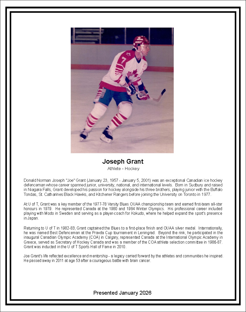 Returning to U of T in 1982-83, Grant captained the Blues to a first-place finish and OUAA silver medal. Internationally, he was named Best Defenceman at the Pravda Cup tournament in Leningrad. Beyond the rink, he participated in the inaugural Canadian Olympic Academy (COA) in Calgary, represented Canada at the International Olympic Academy in Greece, served as Secretary of Hockey Canada and was a member of the COA athlete selection committee in 1986-87. Grant was inducted in the U of T Sports Hall of Fame in 2010.