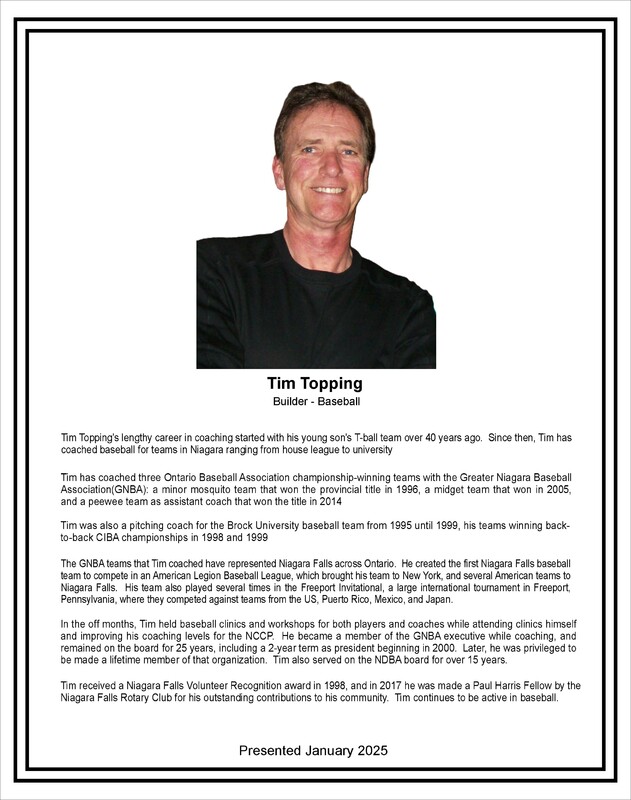 Tim Topping's lengthy career in coaching started with his young son's T-ball team over 40 years ago. Since then, Tim has coached baseball for teams in Niagara ranging from house league to university.