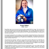 Poppy Gilliam began her soccer journey at the age of six with the Niagara Falls Soccer League. She transitioned to the St. Catharines Jets premier soccer team at age sixteen, playing with them for two decades. She served as captain for 15 years, helping to guide her team to numerous Ontario championships. She proudly represented Team Ontario for two years as both defender and forward and was selected to train with the National Development program, competing with the