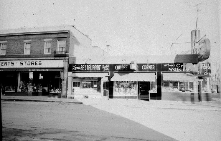 - en-CA (left to right) : 'Kent's Stores', 'Lane's Restaurant', 'Children's Cosy Corner' and 'Robert's China'.