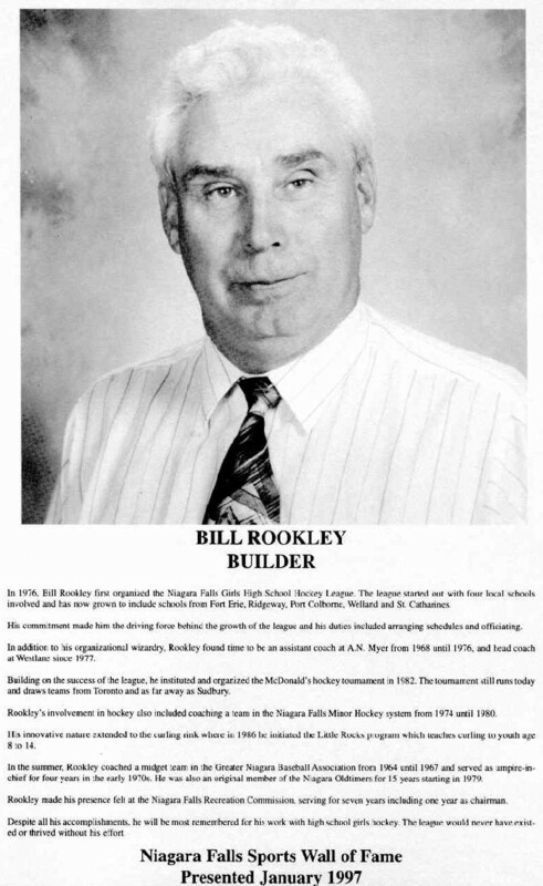 Niagara Falls Sports Wall of Fame Bill Rookley Builder Girls Hockey era 1971 1990