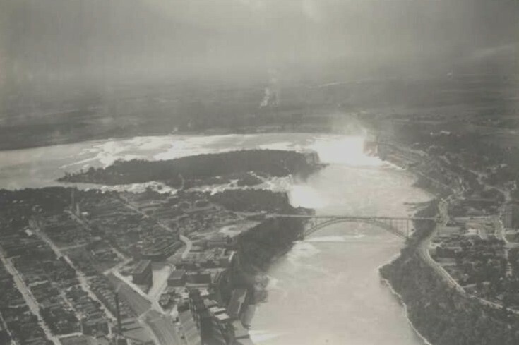 - Aerial view of the Rainbow Bridge and the American and Horseshoe Falls