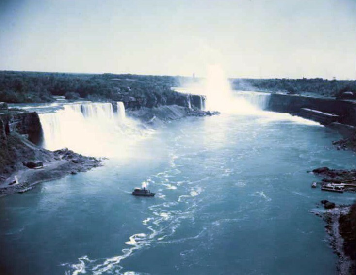 Aerial view of the Maid of the Mist and the American and Horseshoe Falls