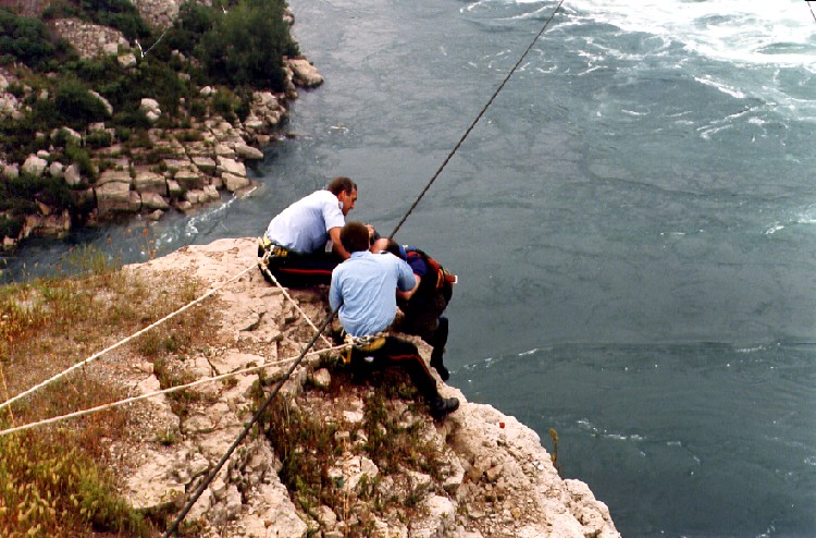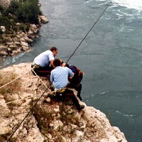 - en-CA On the 9th of September 1990 Peter Debernardi along with Wayne J Harris attempted to hang a Canadian flag from one of the Spanish AeroCar's cables, some 200 feet above the Whirlpool Rapids. He attached himself to the cable by means of a harness and pulley. He then planned to roll himself out to the midpoint of the cable, attach the flag, and then expected to be rescued by the cable car. He attempted the stunt in order to protest the Niagara Parks Commission which prohibits stunting in and around the Falls ; From the personal collection of George Bailey ; Image may not be reproduced without the written permission of George Bailey ;