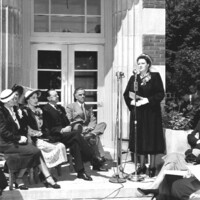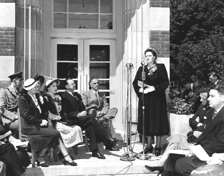 - en-CA The branch was dedicated by His Excellency Field Marshall The Right Honorable Viscount Alexander of Tunis Governor General of Canada ; Miss Winnifred Stokes Chairman of the Library Board at the microphone ; Front Row: Left Mrs W L Houck Lady Mayoress, Lady Alexander of Tunis, His Excellency Field Marshall The Right Honorable Viscount Alexander of Tunis Governor General of Canada ; Mayor W L Houck ; Front row right: George H Hamilton, Louis Drago Library Board members ;